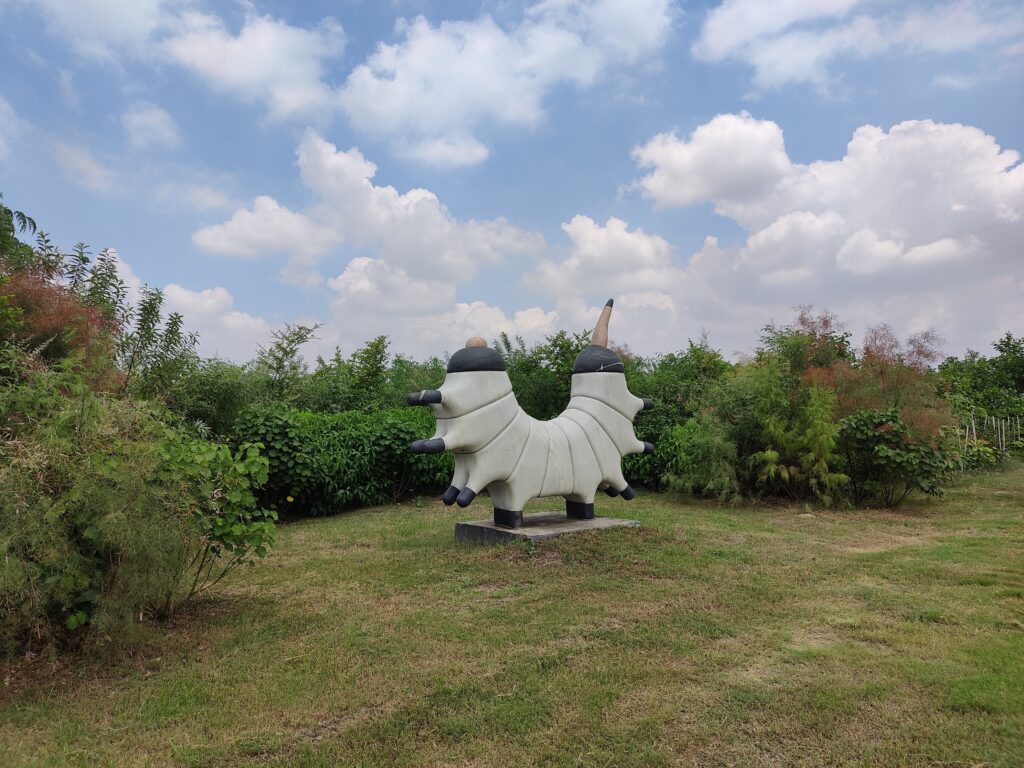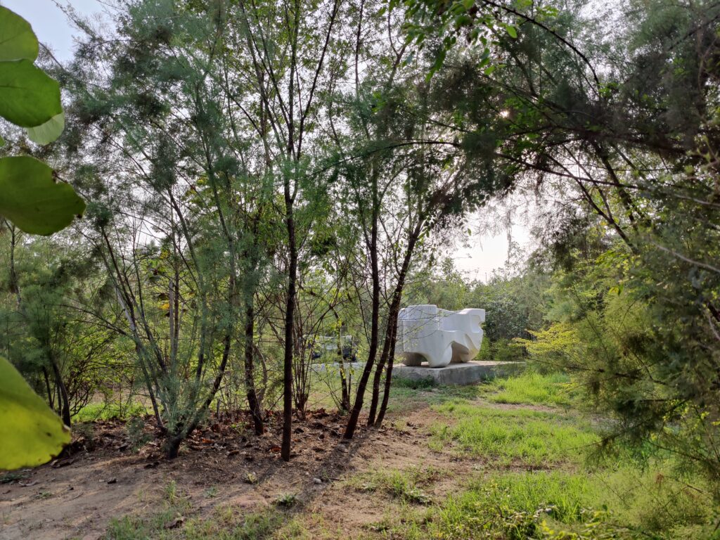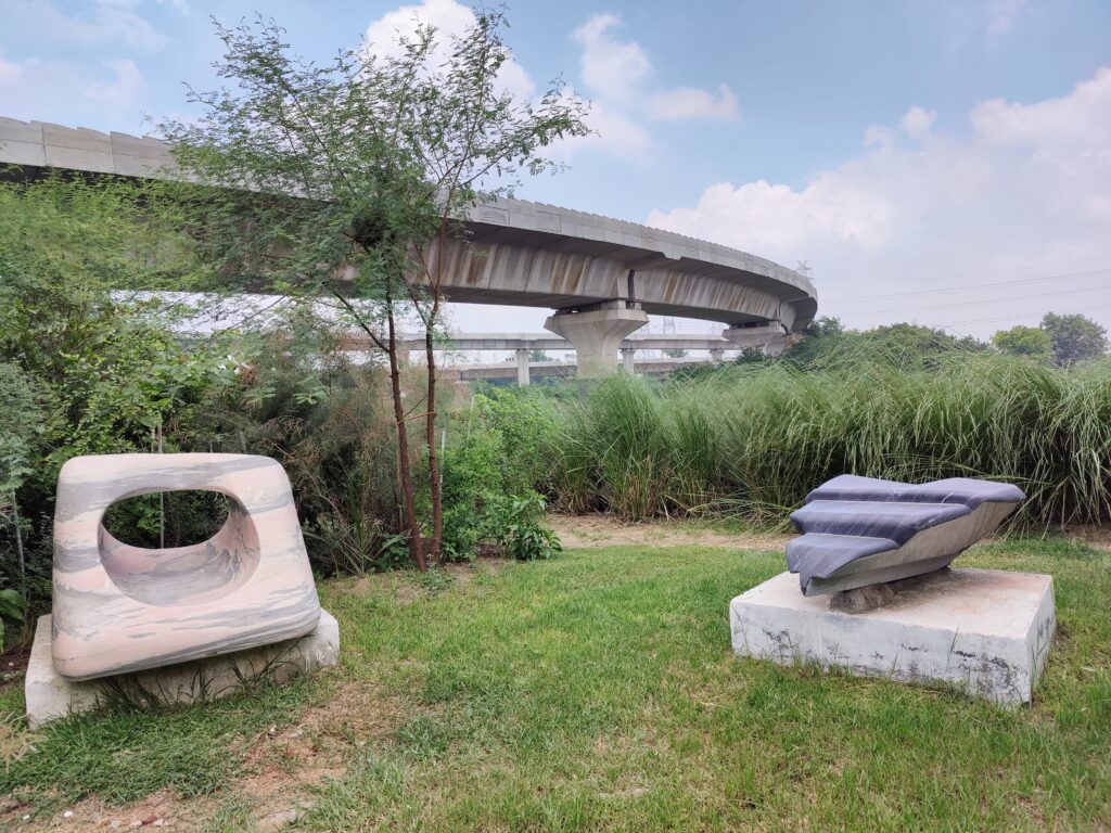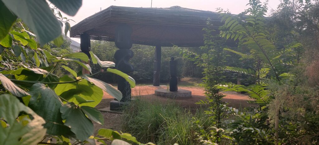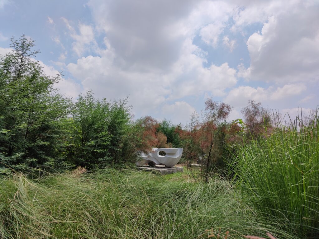 The planting followed natural forest logic—blending pioneers and climax species, shade-lovers and sun-seekers, herbs, shrubs, and grasses in ecological harmony. Over 10,000 plants from more than 50 native species now inhabit the site, including grasses like Saccharum benghalensis, Saccharum spontaneum, and Vetiveria zizanioides. The forest also integrates stone art, raw stone benches, and winding paths. Designed by landscape architect Puloma David and sculptor Robin David, this unique blend of forest and form is called Forestscaping®—where ecology meets aesthetics to inspire connection, curiosity, and care.