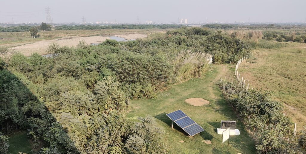 The project was initiated in August 2020 through a collaboration between Indraprastha Gas Limited, the Office of the Principal Scientific Adviser to the Government of India, the Delhi Development Authority, Maruvan Foundation, and Afforestt. The transformation began with a massive clean-up drive. Multiple truckloads of debris, sewage, and the invasive Prosopis juliflora (Vilayati Kikar) were removed using JCBs and on-ground teams. The exposed land—scarred and eroded—was nourished with salvaged soil from nearby infrastructure projects, laying a new foundation for restoration.